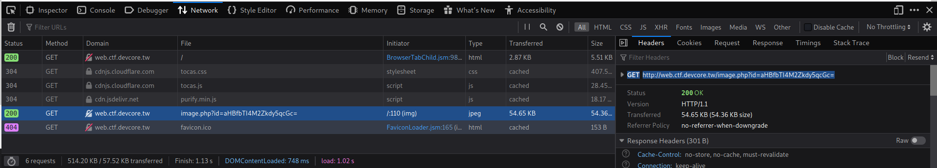 觀察進入網頁首頁的 HTTP Request 可以看到一個明顯可疑的 URL- http://web.ctf.devcore.tw/image.php?id=aHBfbTI4M2Zkdy5qcGc=