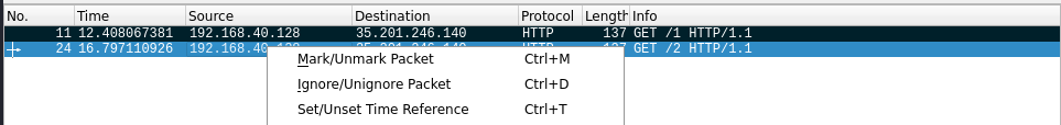 將目標的兩個封包 Ctrl + M 或右鍵 Mark / Unmark Packet 把封包給標記起來
