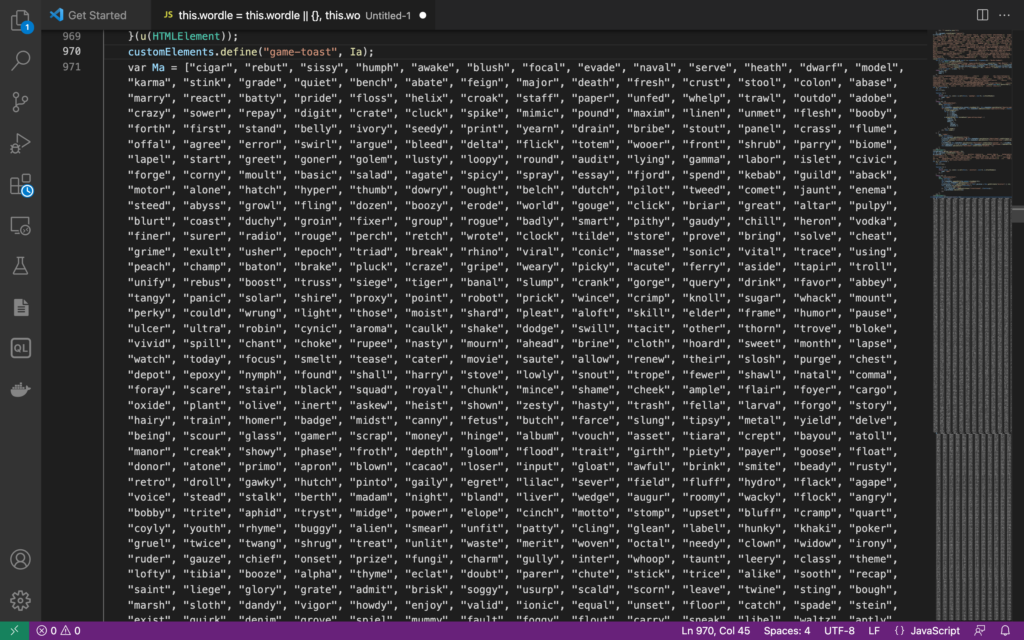 觀察 https://www.nytimes.com/games/wordle/index.html 首頁的原始碼,可以看到一個重點的 JavaScript,main.bfba912f.js (後面的 Hash 可能會變)
