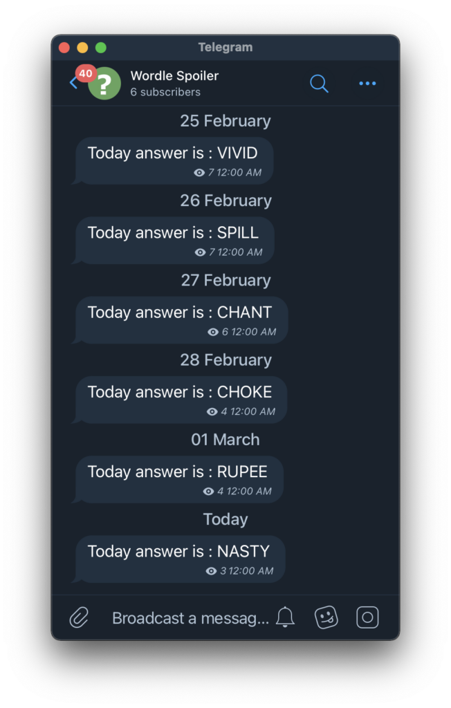 感覺 Wordle 也紅一陣子了,但我覺得最近的題目都好難,都解不出來 QQ,一氣之下就寫了一個 Telegram 的腳本來自動地告訴我當天的答案。