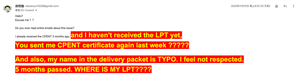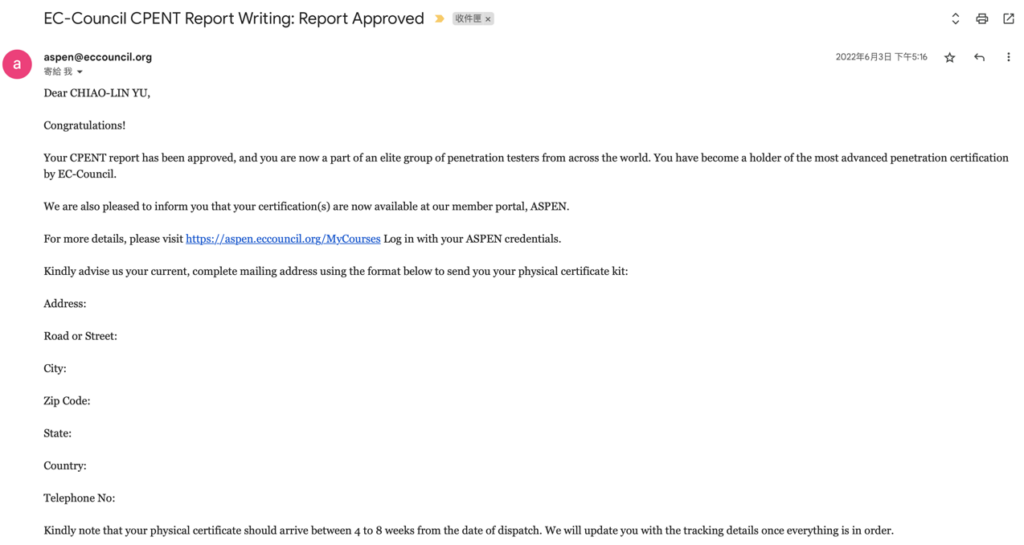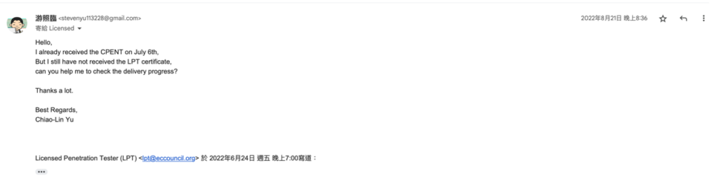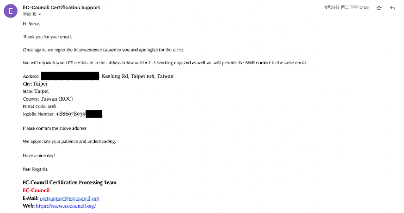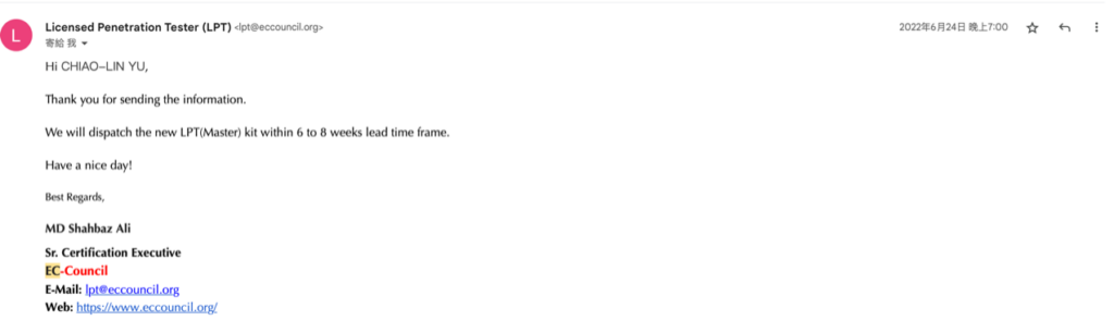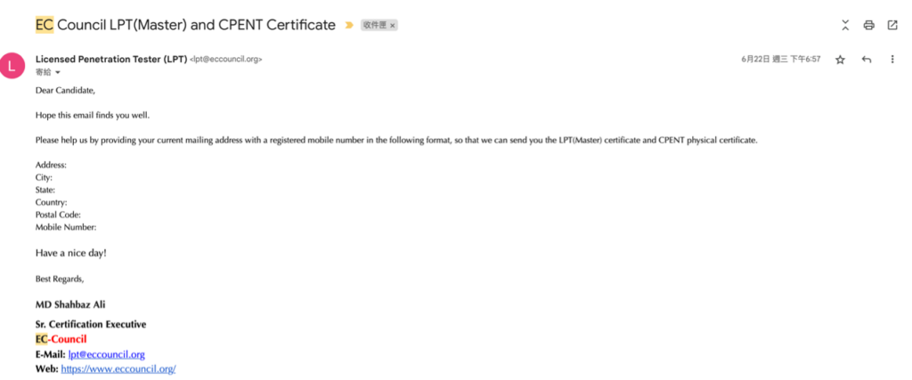 這時我就開始覺得有一點奇怪了,他是裝傻裝做先前那篇 email 沒有收到嗎?還是說 CPENT 跟 LPT 的寄發是由不同單位負責呢?但是這封信上面寫了 LPT and CPENT,感覺或許是作業上出現了什麼問題吧?在回信的 Email 上面簡單碎碎念了一下之後,我再次的給了對方我的地址等資料。
