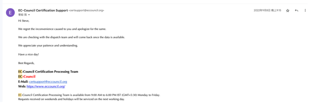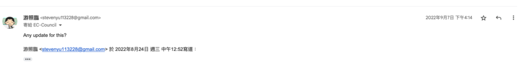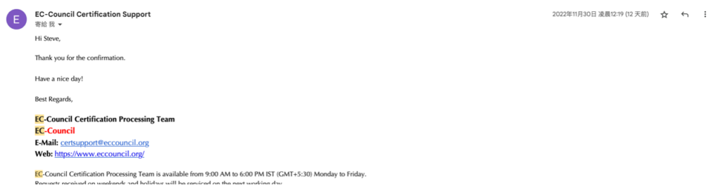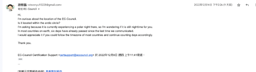 好喔,很明確的知道問題所在了,在 EC-Council 於上方 11 月 29 的信中,問了我的地址與電話,他們是問假的嗎 ……????