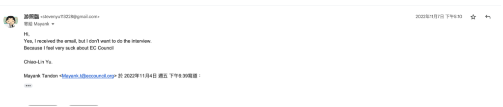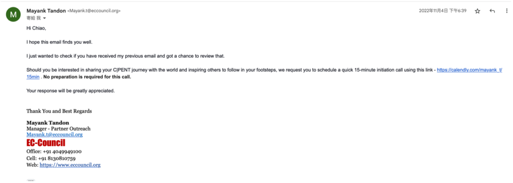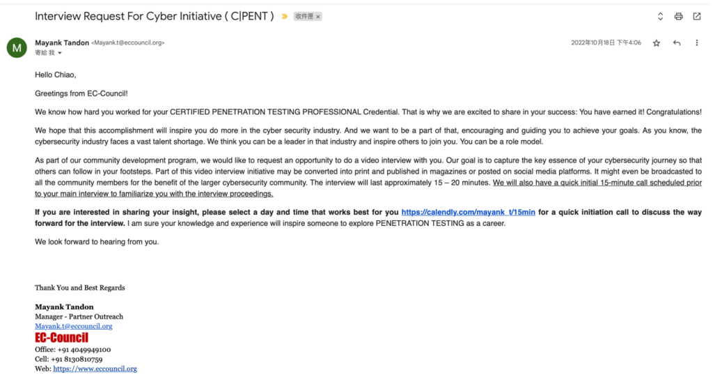 這邊需要插播另外一件事情,在 10 月 18 日時,我收到了另外一個寄件者寄出的 CPENT 訪問邀請,看樣子是希望我分享考試相關的心得,但對於這張爛證照我覺得我沒什麼好講的,就直接放置,懶得回應他們。