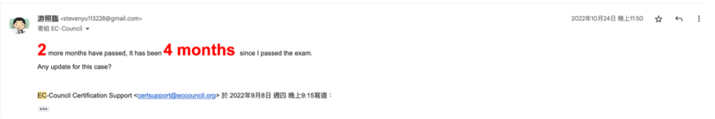 歲月如梭,前一封跟證照寄送相關的信是 9 月 8 日,又等了約 2 個月,到了 10 月24 日,距離我考到證照已經超過 4 個半月了,他們的調查依然沒有任何結果,所以我再寄了一封信過去詢問。這時,我已經有一點點不開心了,所以放大了幾個關鍵的時間,為了這張沒啥用的垃圾破證照,我已經等了 4 個多月了,到底還要等多久。如果還要查的話,我認為也該回信跟我回報一下進度吧……,一等就是兩個月,這真的有一點扯。