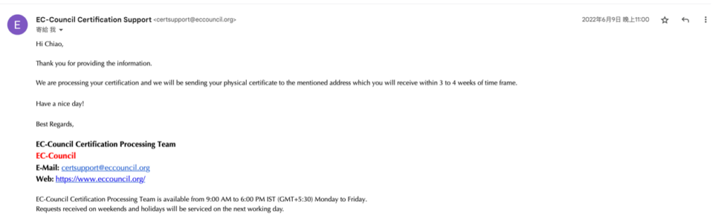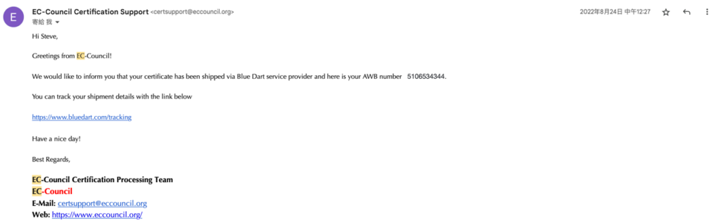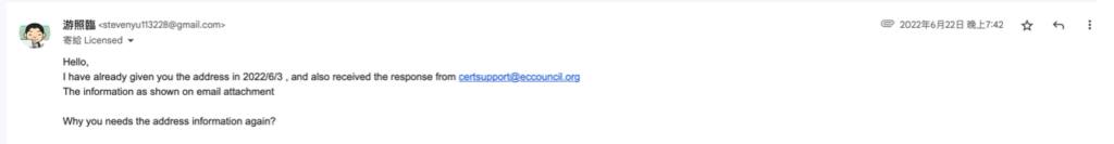到了 6 月 22 日,也就是距離我考到證照後約三週的時間,我又收到了一次 EC-Council 的 Email,來跟我確認我的家裡地址。