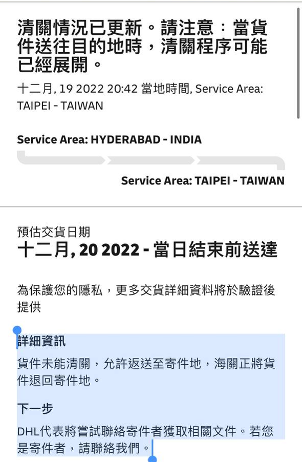 OK,原本我想說,我跟 EC 的這愛恨情仇終於要結束了……,DHL 從印度寄包裹,依據我的經驗來看,大約是 4~5 天可以寄到。但這時,又出現奇怪的狀況了 ……。根據經驗,物品進入台灣時,就會進入報關程序,我手機的 EZWay 應該會收到相關的通知需要許可,但這包裹卻在海關卡了兩天……。