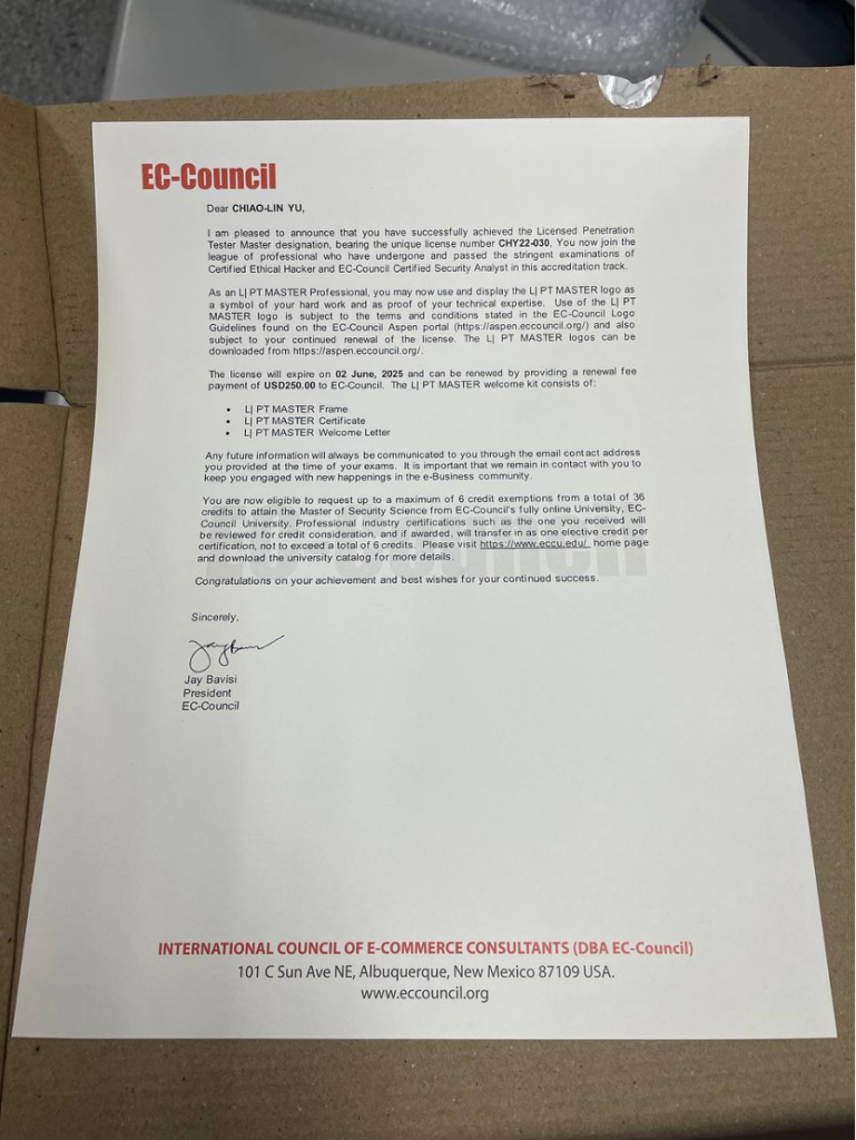 接下來,我在 7 月 6 日收到了我的 CPENT 證照,是透過 DHL 寄送的,包裝有一點被割破了 QQ,除了包裝之外,證書匣上面也有被刀割的痕跡,我是覺得沒關係啦,畢竟這種國際運輸是難免的。