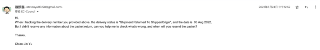 收到信後,我立刻回信通知了 EC 說貨根本沒收到就被退貨了!這個時候是 8 月 24 日,距離我考完證照已經過了 2 個月又 20 天左右。