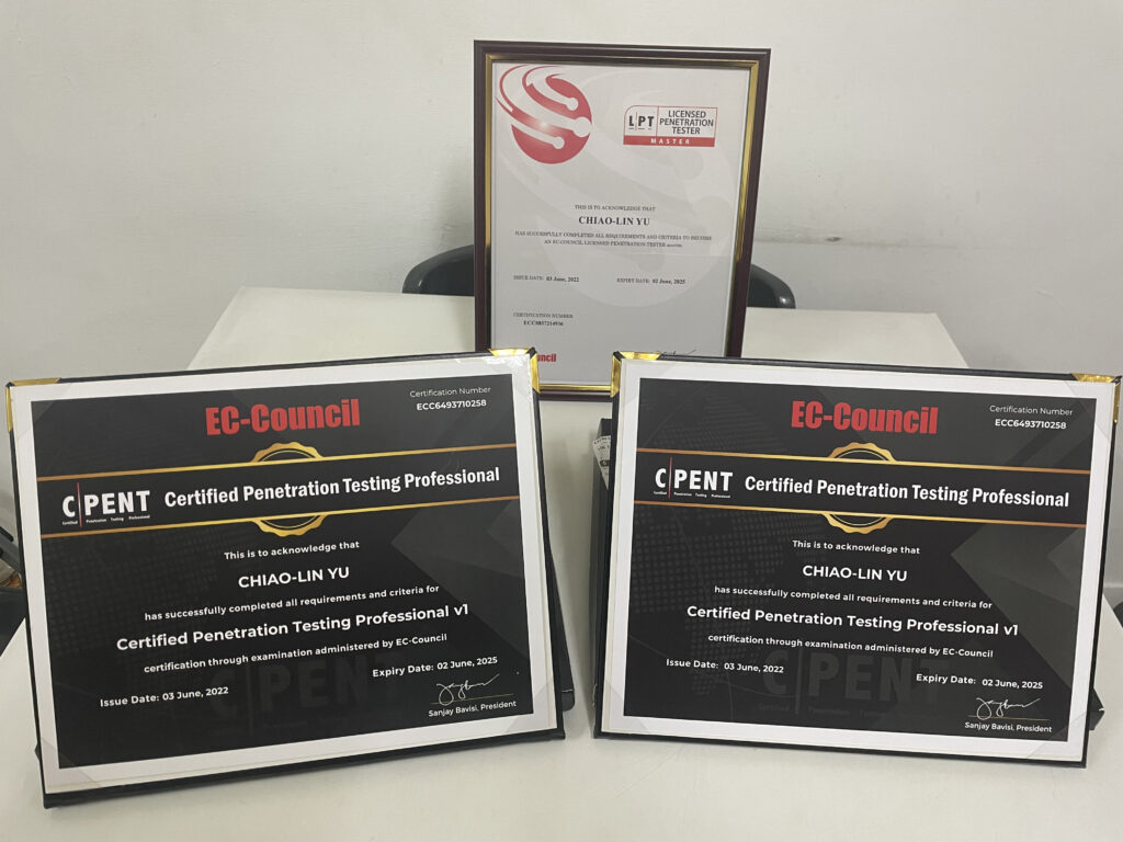 最後附上我手邊的 2 張 CPENT 以及 1 張 LPT 結束這 6 個月又 17 天跟這間不負責任的公司來來往往的旅程。我有另外一位朋友跟我的經歷類似,但他拿到了兩張 LPT 呢!