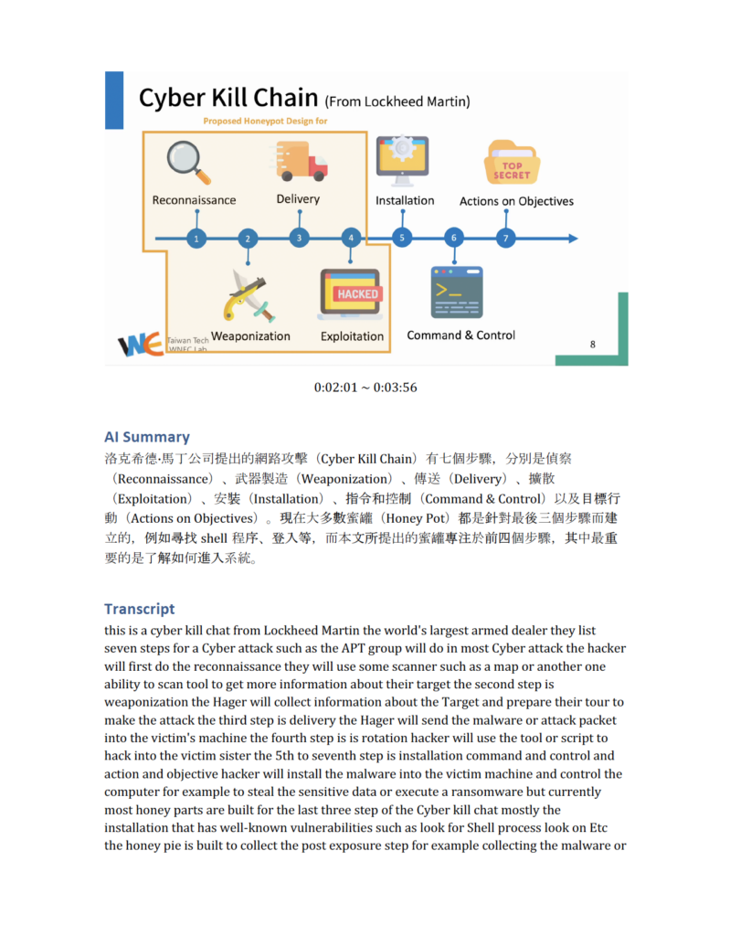 最終,再把結果透過 Python 的 docx 輸出成完整報告,這樣下來只需要不到原始影片三分之一的時間,就可以讀完整份影片的內容,而如果逐字稿跟 AI 對於某段的總結有點奇怪時,也可以直接從報告上取得該頁面的時間,自己切回去影片重新查看!